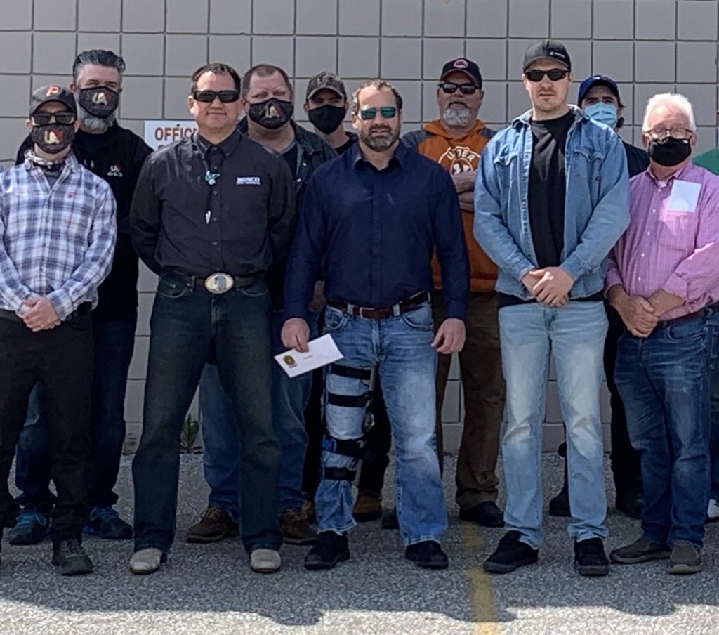 UA members/representatives and Dalas Santavy (front row, center) recognizing IBB’s Ron Simon (front row, left of center) and UA’s Cody Shephard (front row, right of center) for their actions.