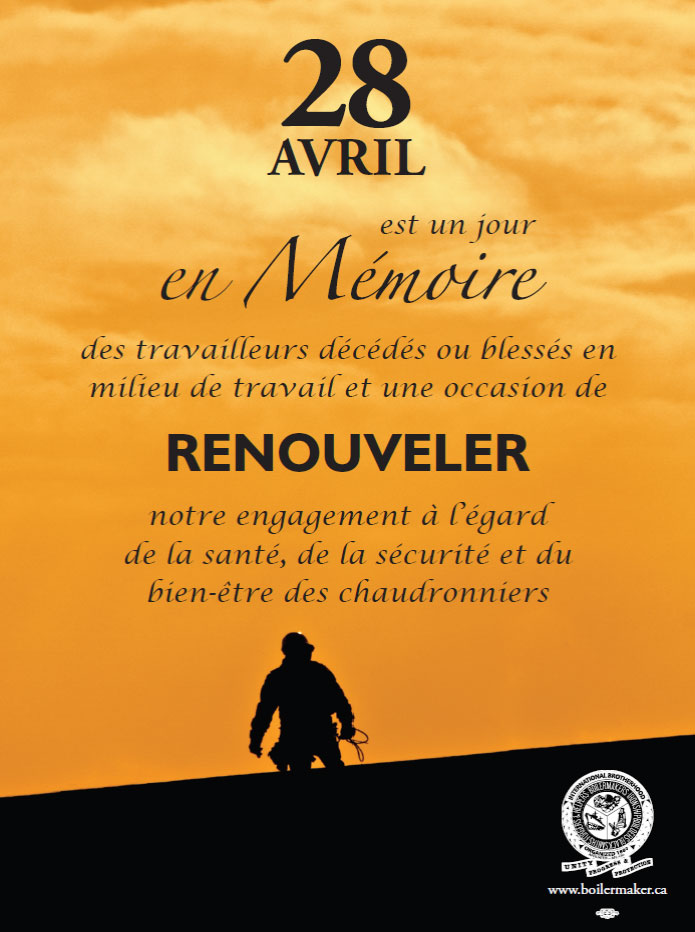 En observant ce Jour de deuil à la mémoire de ceux qui ont souffert ou qui sont morts au travail, nous devons prendre soin de nos confrères et de nos consœurs. Avec notre expérience collective, notre éducation et notre formation, nous avons un rôle à jouer dans la lutte pour améliorer la santé et la sécurité à tous les jours. La santé et la sécurité au travail est une bataille continuelle et je sais que vous êtes de taille à relever le défi.