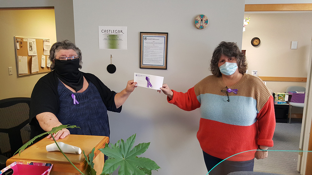 The Castlegar & District Community Services Society embraced the Purple Ribbon campaign. The organization has several programs including Safe Home and Chrissy’s Place. Pictured here Lora Plotnikoff (left) makes a financial donation to the Castlegar Food Bank manager Deb McIntosh (right). The combination of honoring essential workers and supporting food banks was the perfect combination for our charitable donation.