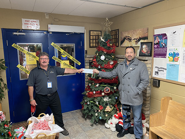 Darrell Bray Boilermaker Business Representative for North Western Ontario donates on behalf of the membership to Volker Kromm Executive Director of Regional Food Distribution in Thunder Bay.