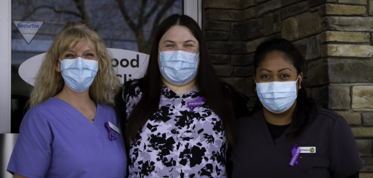 Kick off to YYC Purple Ribbon campaign. Lynwood medical office staff proudly wearing ribbons and collecting with the donation box.