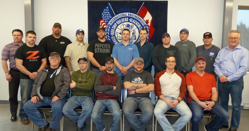 Local 73 Class – Back row (left to right): Jonathan White (National Training Coordinator), Shane Elliott, Steven Russell, Clint MacKay, Nick Munro, Troy White, Gerry Shaw, Raymond MacIntosh, Kirk MacLeod, David Clarke and Grant Jacobs (Director of National Training). Front row (left to right): George O’Brien, Jeff White, Tyler Pettipas, Steven Larade, Paul LeBlond and Dean MacDonell.