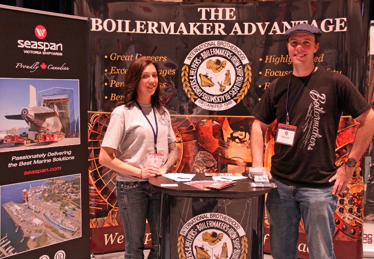 At a Victoria job fair on March 19th, 2015, two members of lodge 191, Shane Skirrow and Carla Karas, were on hand to provide information to those who came to the booth asking about the Boilermakers and Seaspan. Both are a great example of the people who make up the Seaspan crew and the Boilermakers Union. Shane is a red seal fabricator, a work site leader and serves his local lodge as a trustee, while Carla is a welding apprentice who has achieved BC A level, PWP 7 & 10 tickets and a Red Seal welding ticket.