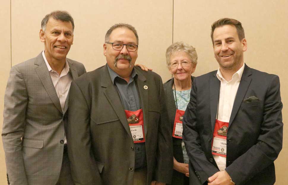[Click to Enlarge] Canadian Labour Congress President Hassan Yussuff poses with his guard of honour. Left to right: Yussuff, Emile Gareau (Lodge 555), Denise Bolton (Lodge D488) and Michel Trepanier (Lodge 271). (Photo: Richard MacIntosh)