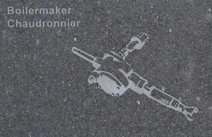 This monument was envisioned by International Vice President Joseph Maloney. While he was Chair of the Canadian Building Trades, IVP Maloney promoted and raised funds for the monument. It was fabricated in Ontario with Cambrian black granite from Quebec. It features two plumb bobs, a tool that has been used by construction workers since building began, and is surrounded by black granite "tools of the trades", each engraved with the name of a trade and the trade tool. For the Boilermakers, a rolling gun is depicted.