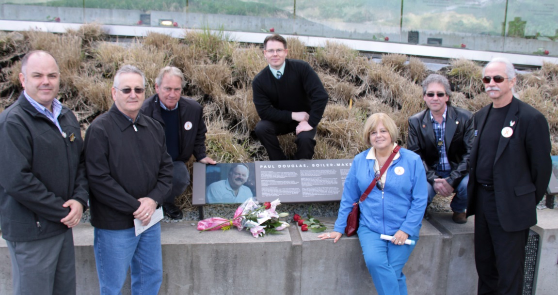 National IBB H&S Committee Members pose for a photo with the Paul Douglas monument (Lodge 359 member) that was erected by Worksafe BC. (Left to right) Jason McInnis (National H&S), Grant Jacobs (NTTF), Rod Lauzon (Industrial Sector), Jonathan White (NTTF), Darrel Bray (L-555), and Randle Shaw (L-146). In the front center is Sharon, the wife of Paul Douglas. Photo by Richard MacIntosh (IR)