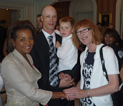 Governor General of Canada Michaëlle Jean (l.) greets L-146 member Mack Walker and his family after presenting him with the Canadian Medal of