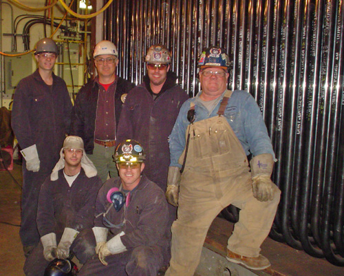 Walter Driedger, B&W's superintendent for the job reports, "This was one of the youngest crews to overhaul a boiler. Joel Wray just turned journeymen, Mike McMullin is a third year apprentice, Cote Fekete is a second year apprentice, Conrad Bremaud is a permit welder on his first job with the Boilermakers, Brandon Want, just turned 18 and graduated high school, on his first job with the Boilermakers and Billy Purvis, the foreman and seasoned Boilermaker took the lead."